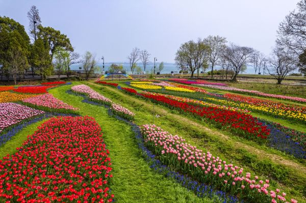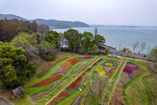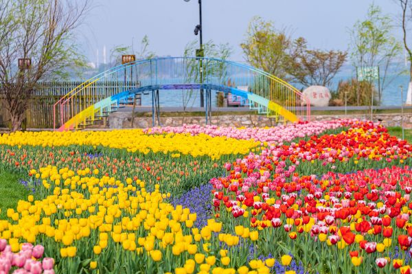湖岸带郁金香花田则是新晋热门展区,该展区依傍东湖和东湖绿道二期,绿草如茵,视野开阔,郁金香也最先迎来开放。30多个品种的郁金香混合、组合播种,缤纷颜色醉了游人。蓝天、白云、湖水、草地与姹紫嫣红的郁金香交相辉映,美不胜收。