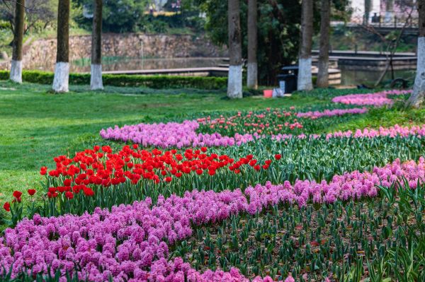 “结合地势地形和生境特色,打造郁金香花田、花溪、花径等,让游客充分走进感受美好,是这次花展的最大亮点。”该园相关负责人介绍,五个展区各具特色,平地景观以经典的花海、花田的形式布局,展示郁金香丰富的品种资源和色彩特点;水系景观打造自然错落、意韵流动的滨水景观;林下景观充分考虑郁金香与草坪、树木的环境相容,再现“林地花溪”“林地花径”的唯美意境。同时,园方充分考虑人行游线,将游览路线融入展区中,打造“风景美如画,人在画中游”的生态画卷。