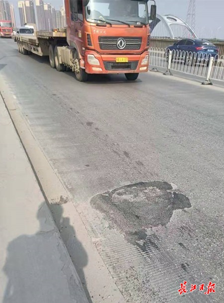 3月15日,长江日报记者在现场看到,新河大桥上车来来往,其中有不少是大型货车,过往车辆车速较快;桥面上打了10处补丁,维修人员用沥青混凝土对桥面破损处进行了修补。