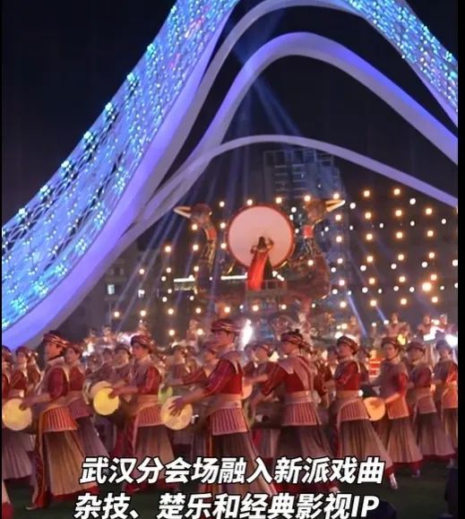 光谷广场的鼓舞表演以虎座鸟架鼓为核心,结合现代科技呈现传统楚乐气势,近千名鼓手围绕巨型虎座鸟架鼓摆出不断变化的鼓阵。