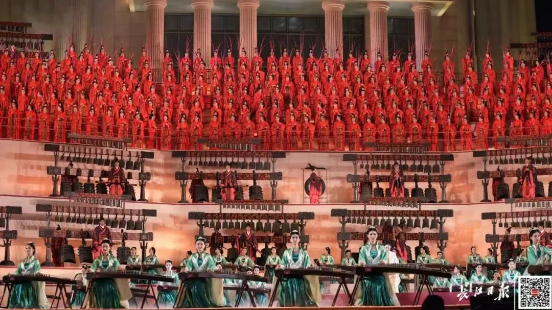 在横渡长江博物馆前聆听楚乐与江水的和鸣。500人规模的楚乐合奏在此上演,编钟、古琴等传统乐器与长江游船联动,展现荆楚文化的壮阔。
