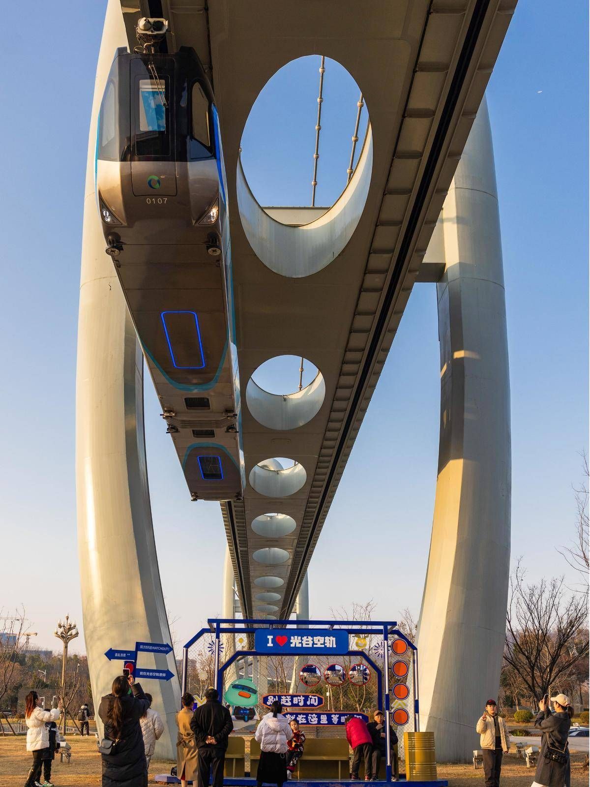 欣赏完星河广场光影秀,从光谷广场站乘坐地铁11号线,短短数站后,就可在高新大道站体验“赛博光谷”的流量担当——光谷空轨。