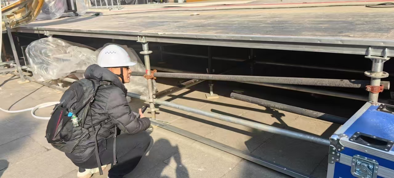 在舞台搭建过程中,江滩舞台和黄鹤楼舞台面临着特殊挑战。江滩舞台处于临江大风区域,搭设的灯光脚手架高达18米,初期钢管直接落地在江滩草坪上,承载力不足。工作专班发现问题后,迅速组织相关行业专家研究,提出在钢管底部增加垫板、增加脚手架宽度、增加配重及缆风绳等技术改进措施,有效保障了架体稳定性。