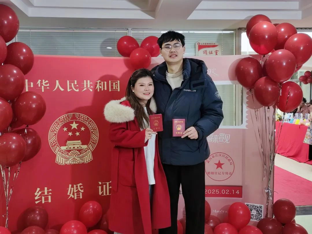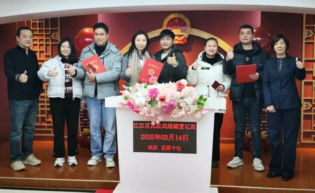 现场,江汉区民政局婚姻登记处与企业联动举办“心手相牵 缘定江汉”——俭约婚姻新风尚,幸福家庭共起航主题活动。通过“集体颁证”“非遗传承”“善行留影”“新人寄语”,婚礼咨询等活动形式,在有序办理婚姻登记同时,为新人们打造了一场温馨而难忘的婚姻登记体验。