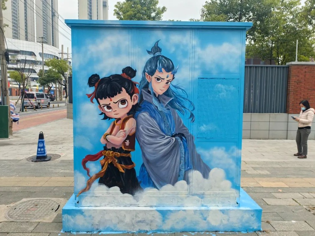 我们兴致勃勃地走向第二个电箱。只见一面是魔丸与灵珠幻化而成的,象征着哪吒和敖丙神仙友谊的合照;另一面则是古灵精怪的哪吒,嘴角叼着一根翠绿的枝条,仿佛在欢快地宣告:“我把春天召唤回来啦。”