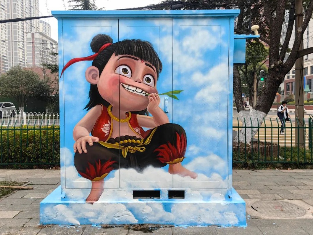看着这个长方体的电箱,我心中一动,预感另一面或许也有精彩画作。果然,当扎着丸子头、大眼睛咧嘴笑、红混天绫随风飘飞、脚下火焰熊熊燃烧的哪吒呼之欲出,儿子兴奋得一蹦三尺高。