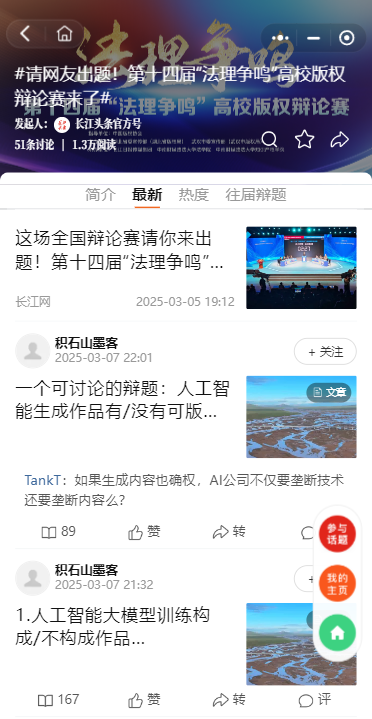 市民网友积极参与长江头条#请网友出题!第十四届“法理争鸣”高校版权辩论赛来了#互动话题。