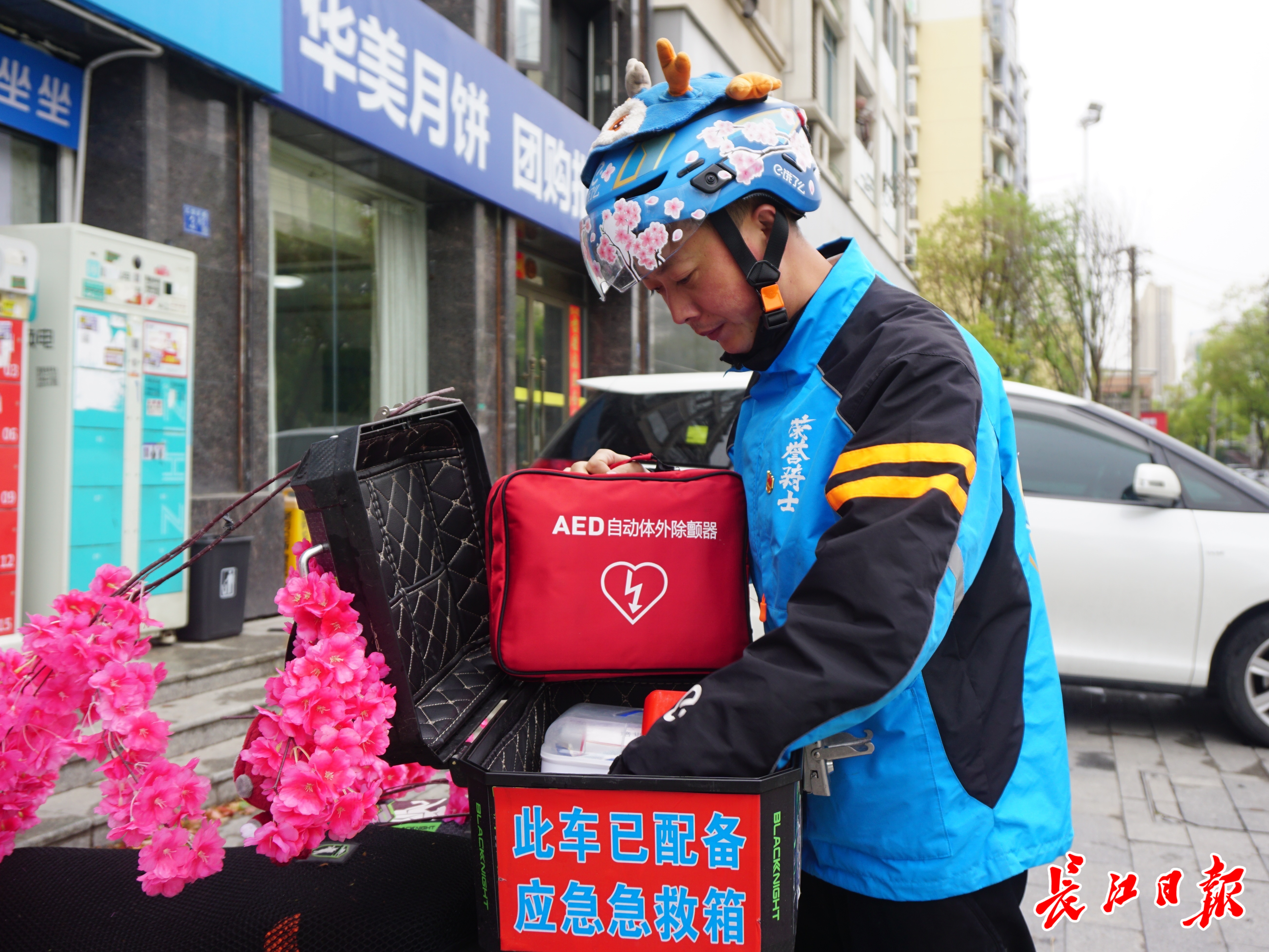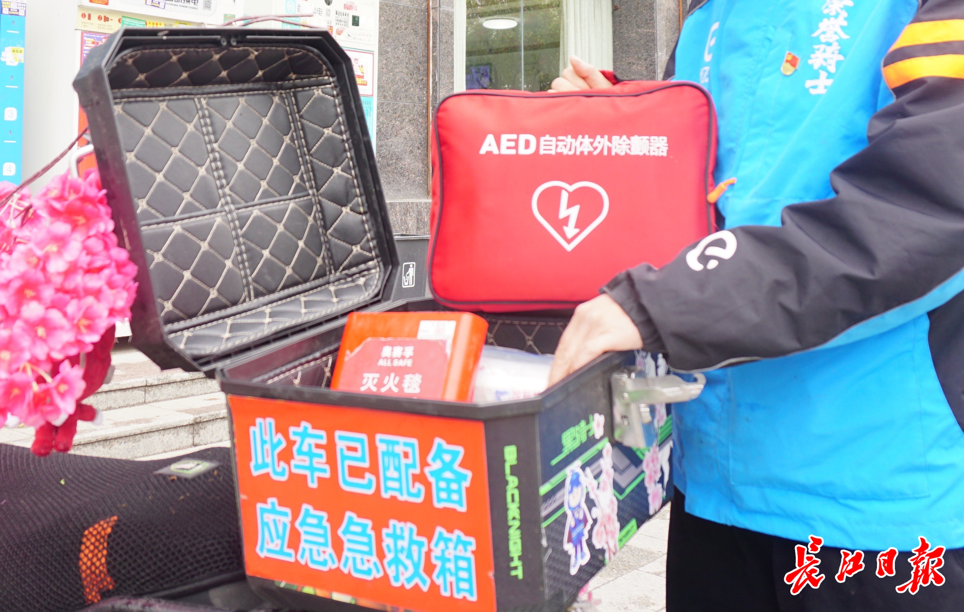 最近几年里,张宝剑陆续考取了红十字救护员证书、救护师资证书、AHA国际急救证书,学会了不少专业急救知识。在由江汉区社会工作部与汉兴街道联合组织的为外卖员送关爱的活动上,张宝剑被问及还有哪些需求,他便申请了这台AED,并很快将其放入“百宝箱”。他叮嘱骑士队的二十多位骑手,如果在路上遇到呼吸暂停的伤者,立刻给他打电话,他随叫随到。