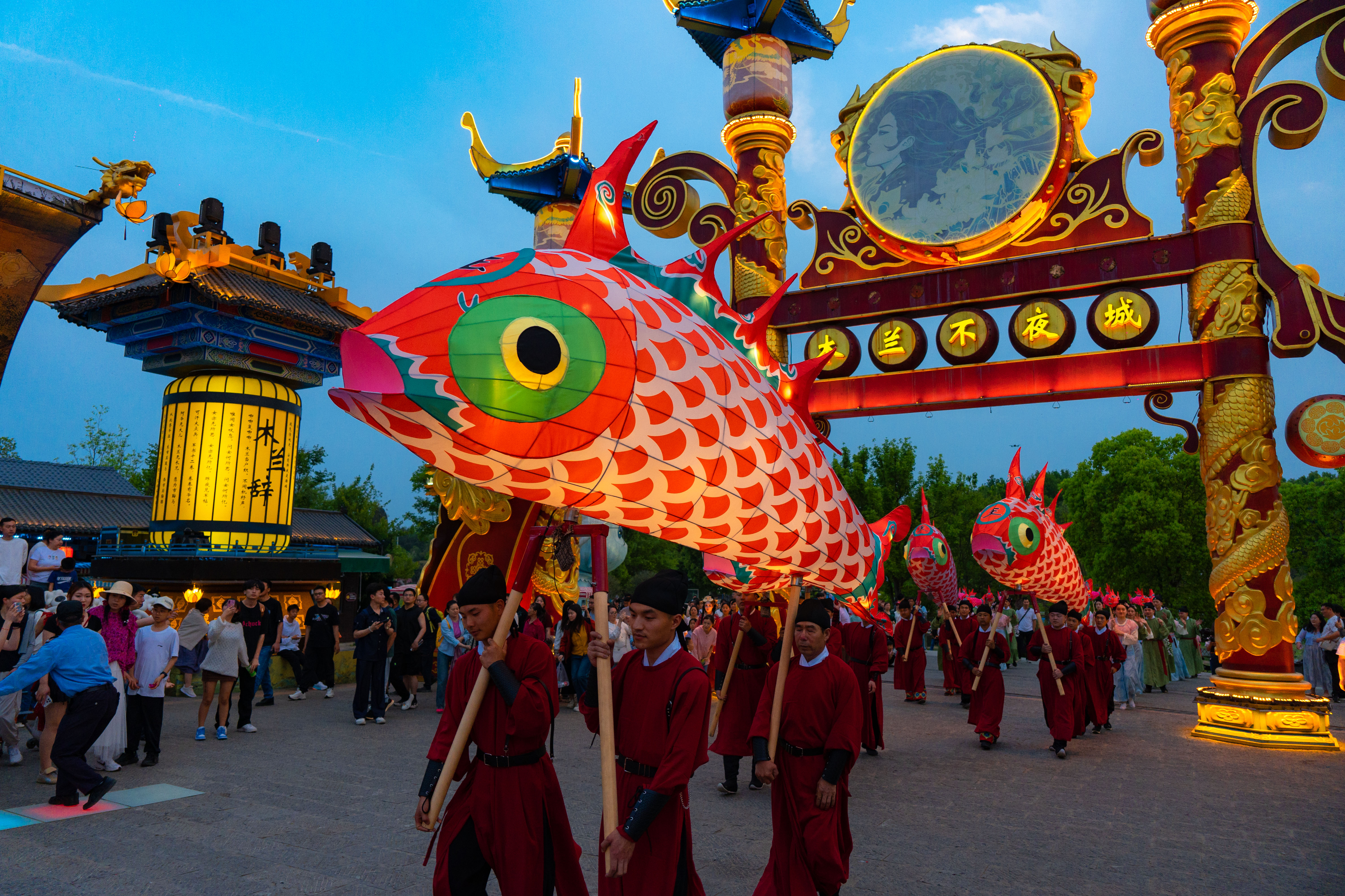 傍晚时分,随着铿锵的锣鼓声,一场如梦似幻的渔灯巡游正式拉开帷幕。巡游队伍自游客中心出发,4米长的队伍在冷烟花与璀璨灯光的映衬下熠熠生辉。巡游路线贯穿篝火广场、东市里直至将军府。历时近一小时的表演让游客仿佛穿越回《木兰辞》中的北魏盛世。“漫步在渔灯长廊,仿佛穿越千年。”身着汉服的信阳游客王女士赞叹道。