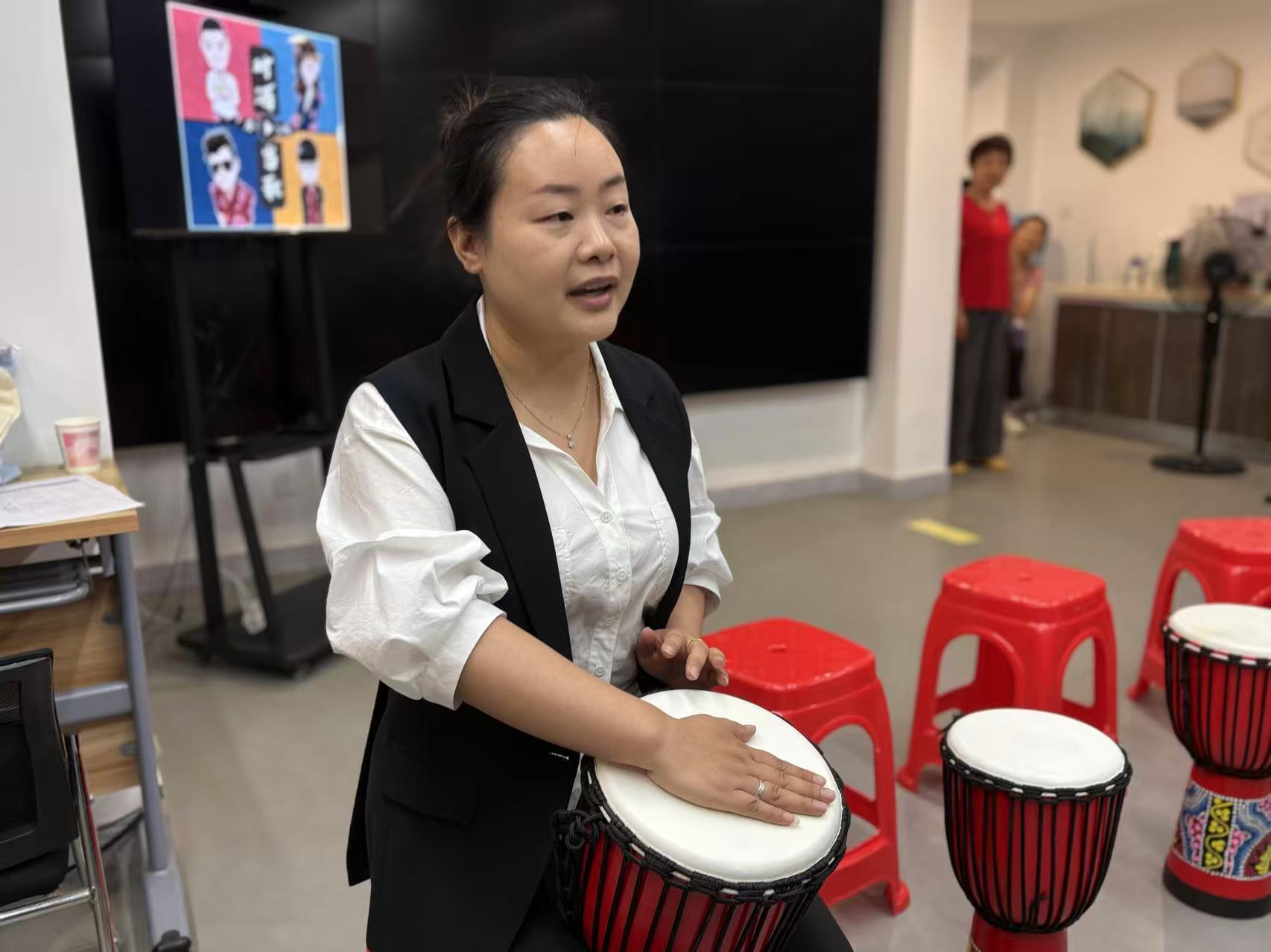 社工赵静是服务者之一。她告诉记者,刚入户探访时,服务对象反应冷漠,直到上门多了,和患者们成为朋友,他们才慢慢“被打开”。赵静发现,很多患者爱好音乐,“他们喜欢但缺乏平台”。于是,她和同事组织大家听音乐、唱歌。机构还请来一名退休声乐老师担任志愿者,社工黄蓉自学非洲鼓并主动担任老师。