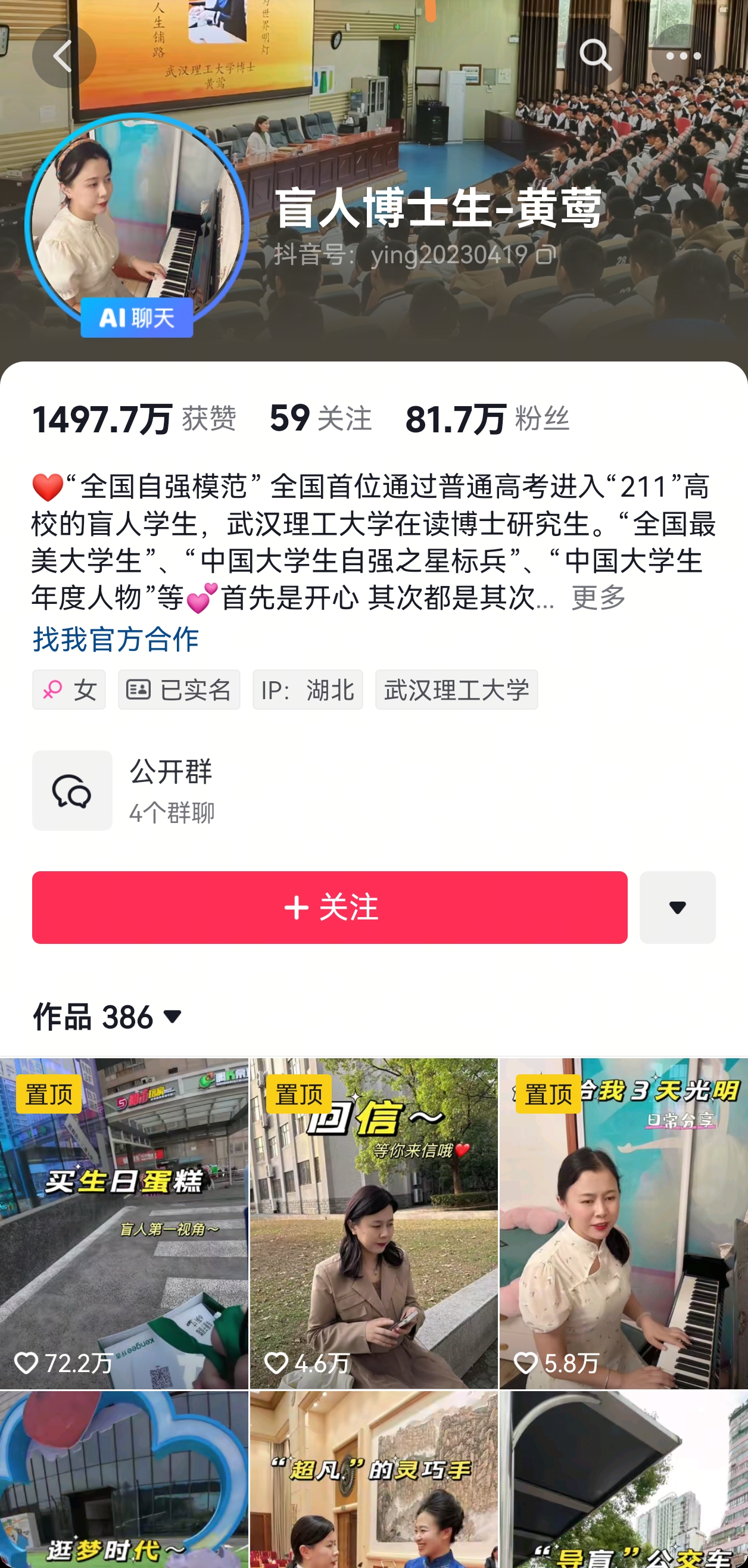 “看不见,可能是我们人生中遇到的诸多困难;而什么都能做,则是我们面对这些困难的勇气和宣言。”黄莺持续在社交平台发布短视频,她的乐观自信自强感动了无数网友,几乎每条视频都有数万网友点赞。
