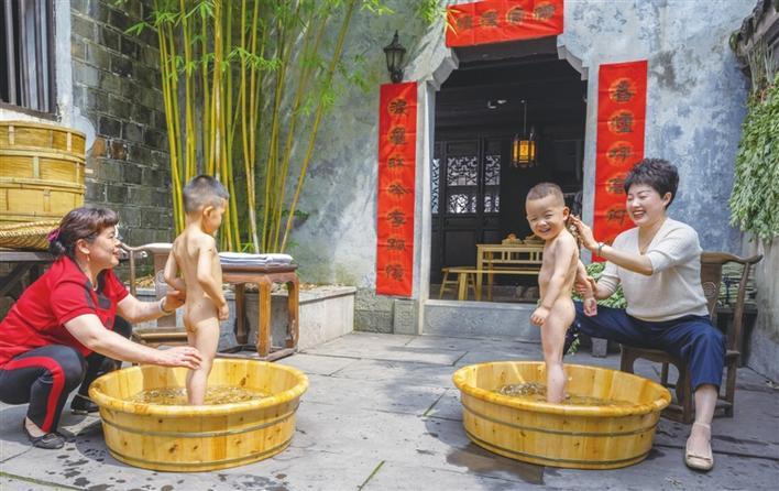 5月28日,秭归县居民在古民居内为小孩子洗艾叶浴,祈求孩子身体健康。通讯员 郑家裕 摄