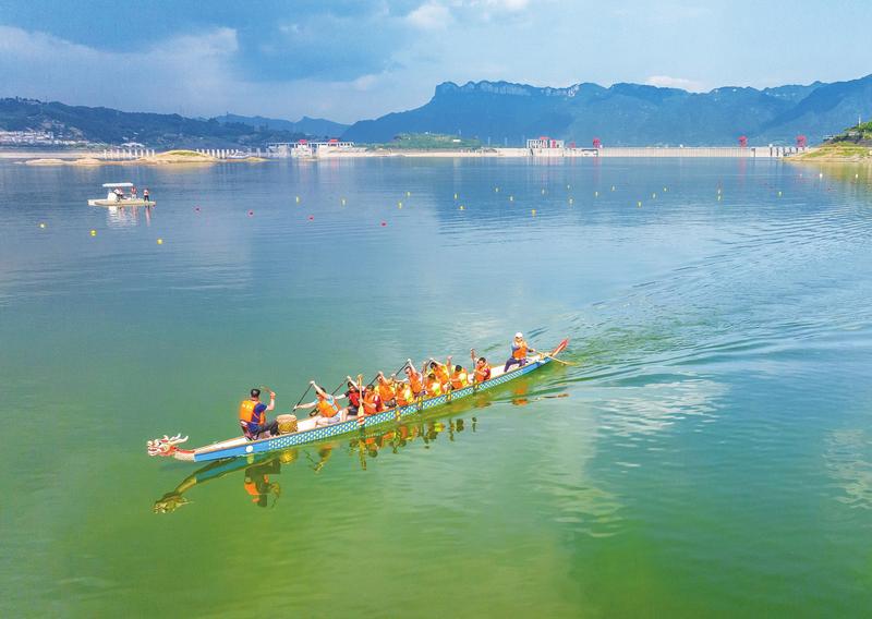 5月28日,秭归县居民在三峡大坝前开展划龙舟训练,为端午节龙舟赛做准备。 (通讯员郑家裕 摄)