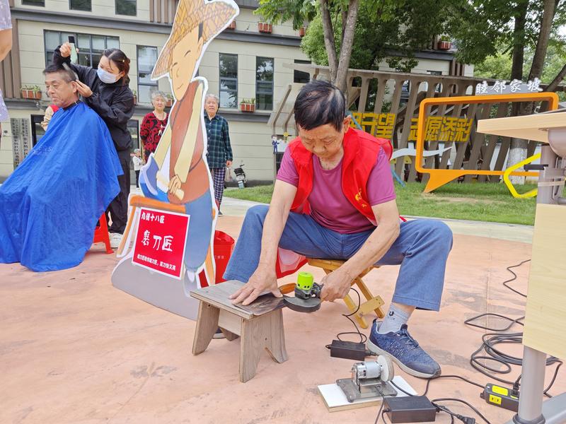 除了游戏互动,磨刀、理发、健康体检、电器维修等“壹元公益”九佬十八匠便民活动也受到居民欢迎。家住广场对面、90岁的廖世英奶奶前来参加活动,看到能磨刀赶忙回家拿来两把剪刀,参加“壹元公益”。“早就想磨下这两把剪刀了,不知道去哪儿磨,搞活动很喜庆,便民服务更是方便了我们老年人。”