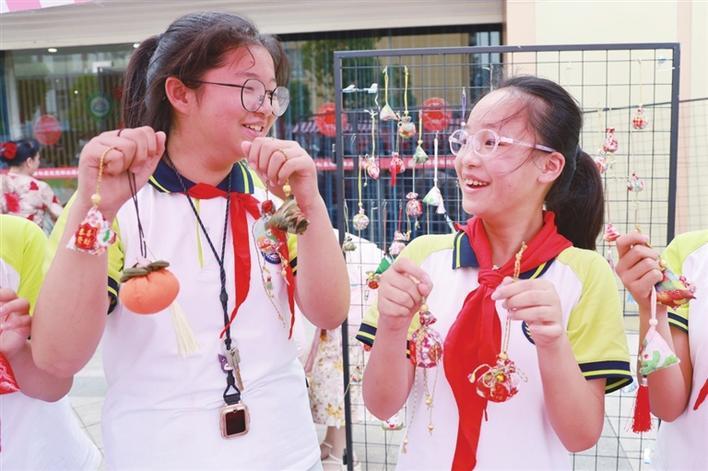 5月27日,孩子们展示自己制作的香囊。当日,伍家岗区伍家乡花溪路社区、伍家岗区实验小学花溪路校区共同开展迎端午主题活动。 记者黄翔、通讯员黄珺 摄