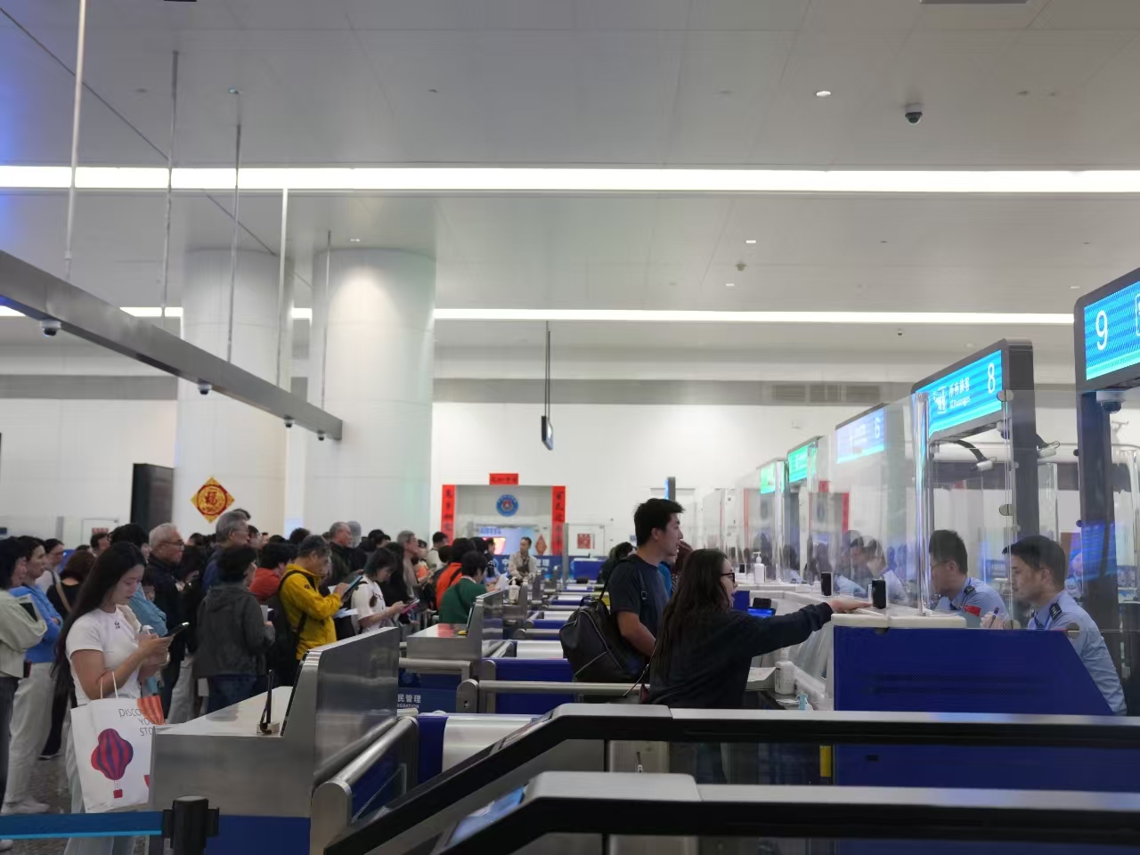 武汉天河国际机场口岸大厅里,旅客正在办理边检手续。通讯员王璐颖摄