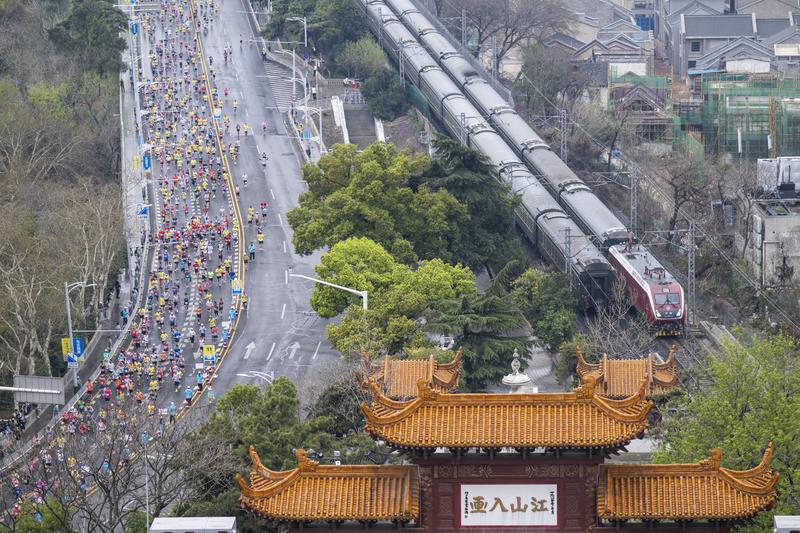 3月23日,武汉马拉松参赛选手经过黄鹤楼。新华社记者 伍志尊 摄