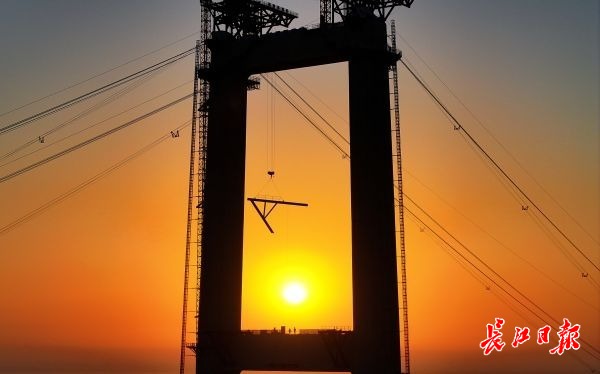 2024年11月28日7时17分,太阳刚露出水面,大桥施工人员赶在长江江豚出没高峰时段之前错峰施工。