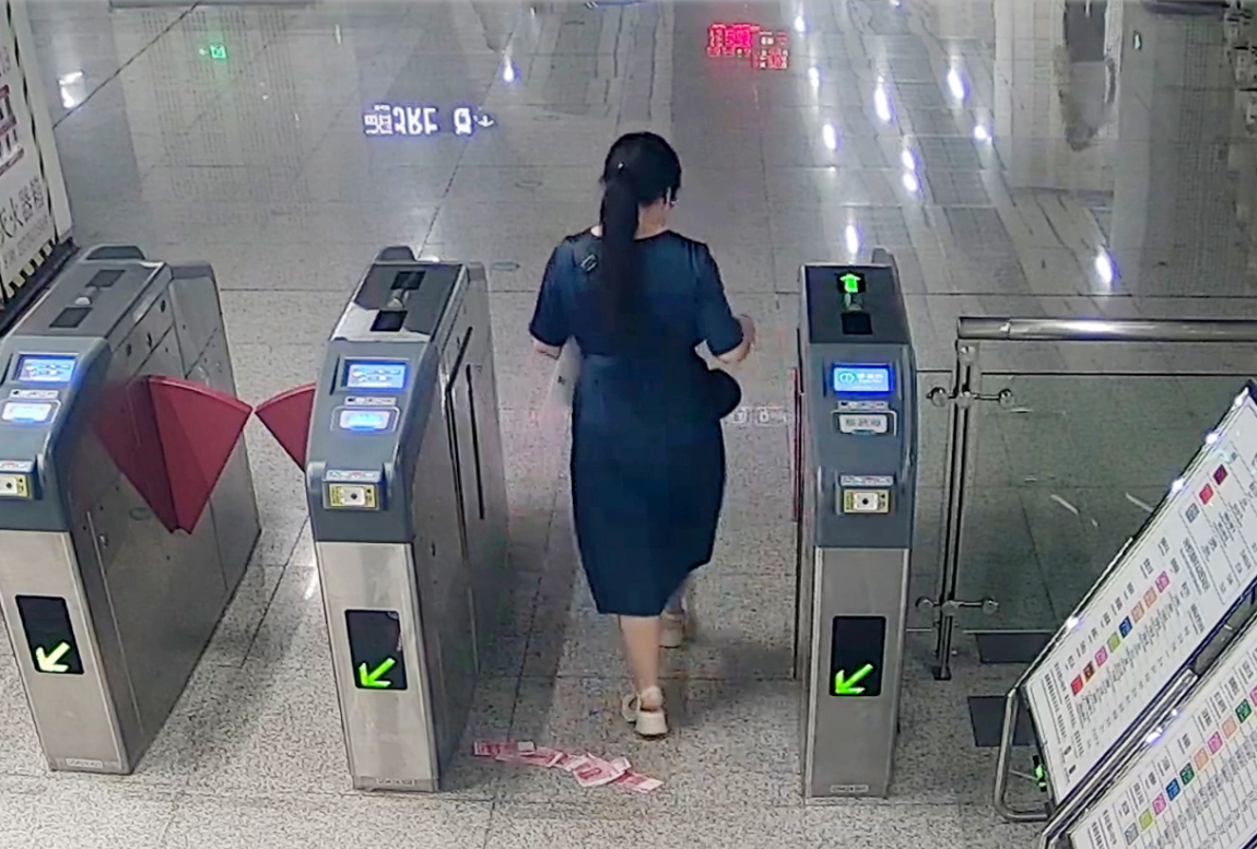 当日下午5时10分,一位穿深蓝色连衣裙的女士在8号线徐家棚站通过安检后进站,经过闸机刷卡时,夹在胳膊的快递袋开口朝下,一沓百元现金滑出来,她完全没有发现。