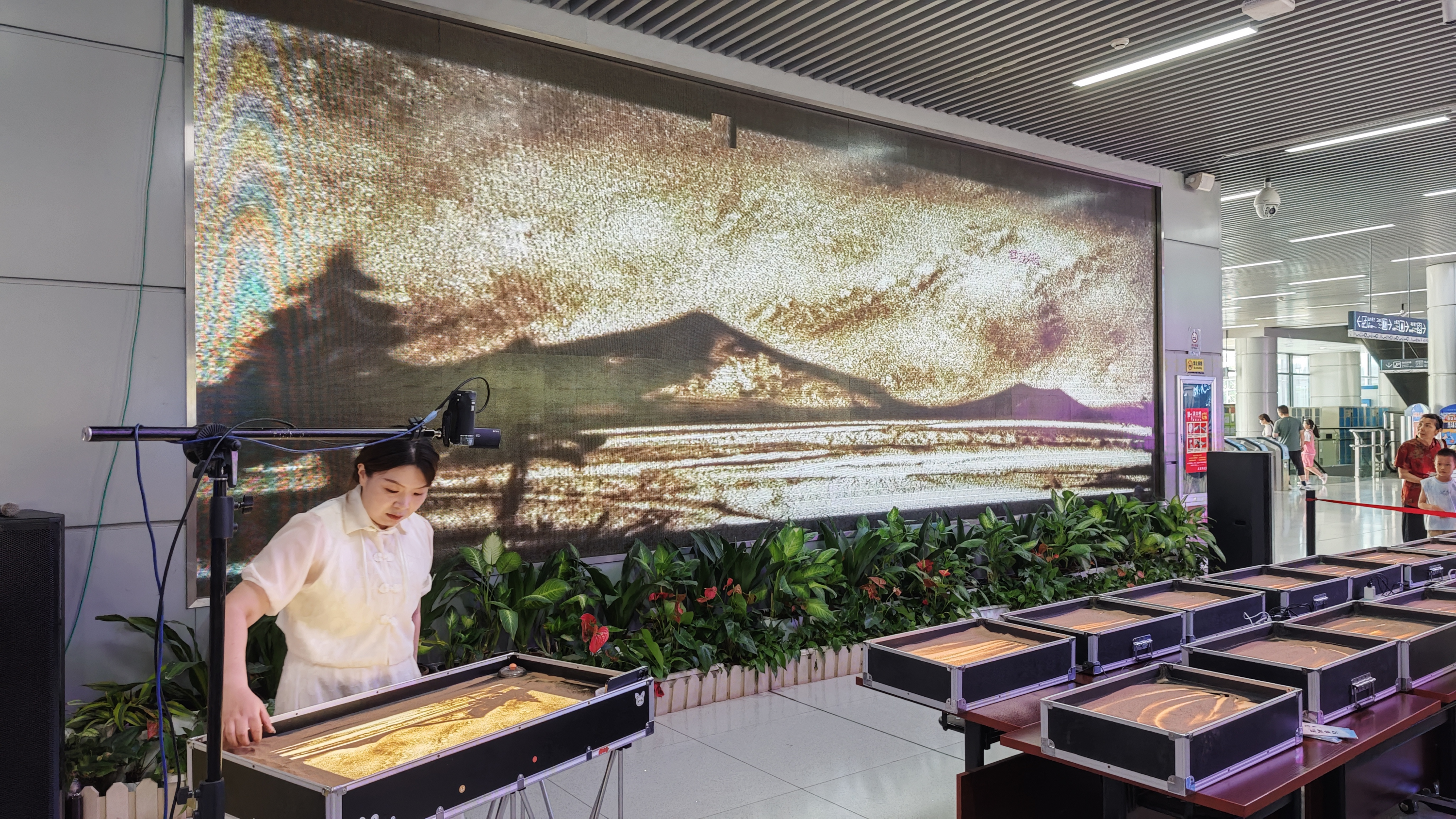 沙画师正在沙画台上“作画”。一盘散沙经过沙画师撒、铺、勾、抹、漏等专业手法,为观众再现了地球南北极附近出现的自然奇观——极光的动态演变过程。遥不可及的自然现象和深奥的科学知识通过艺术手法生动地展现在观众面前。虽然沙画版的极光不是彩色的,但当艺术与科普相遇,瞬息万变的极光与转瞬即逝的沙画完美融合在一起。科普也能如此浪漫。