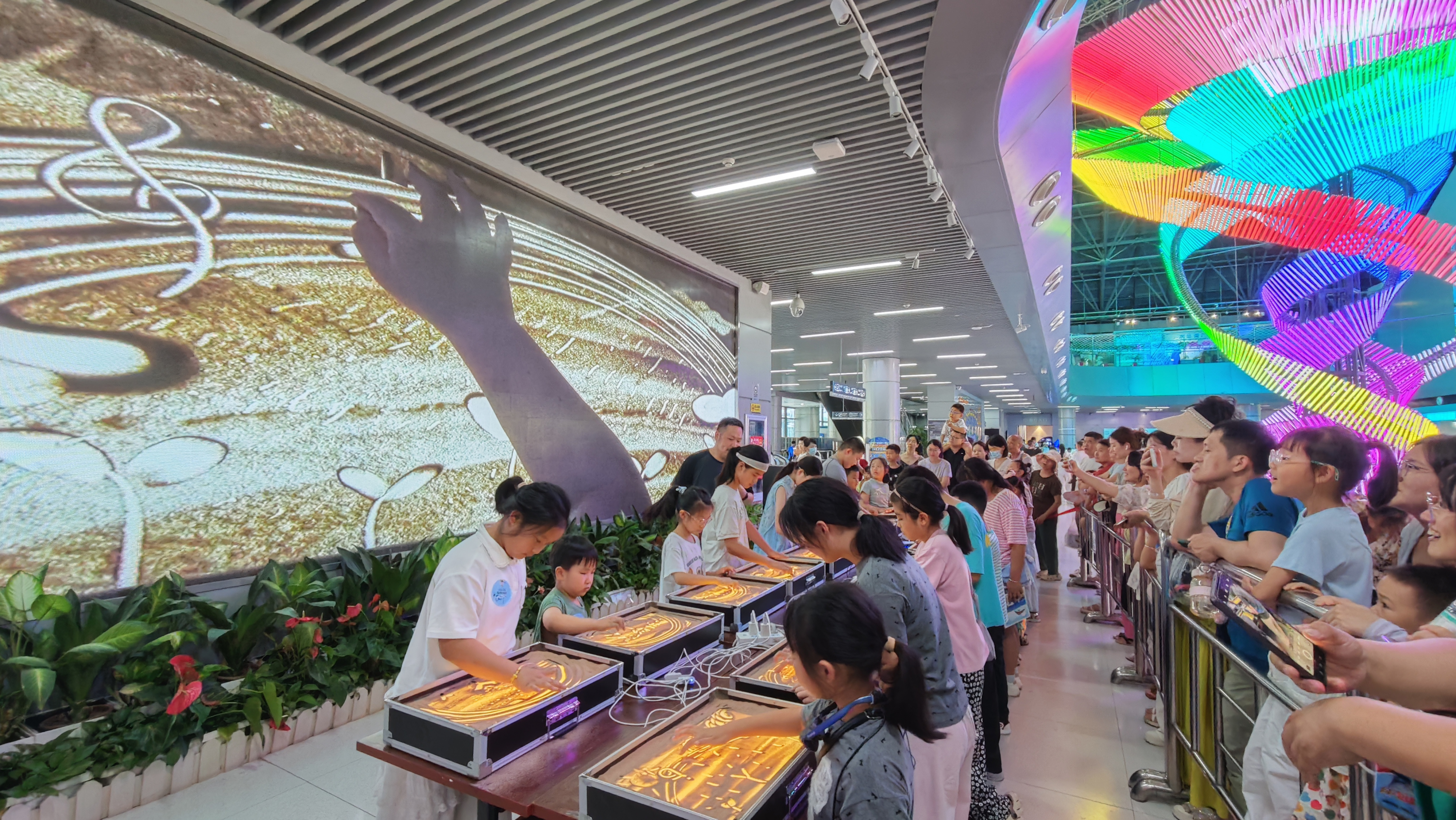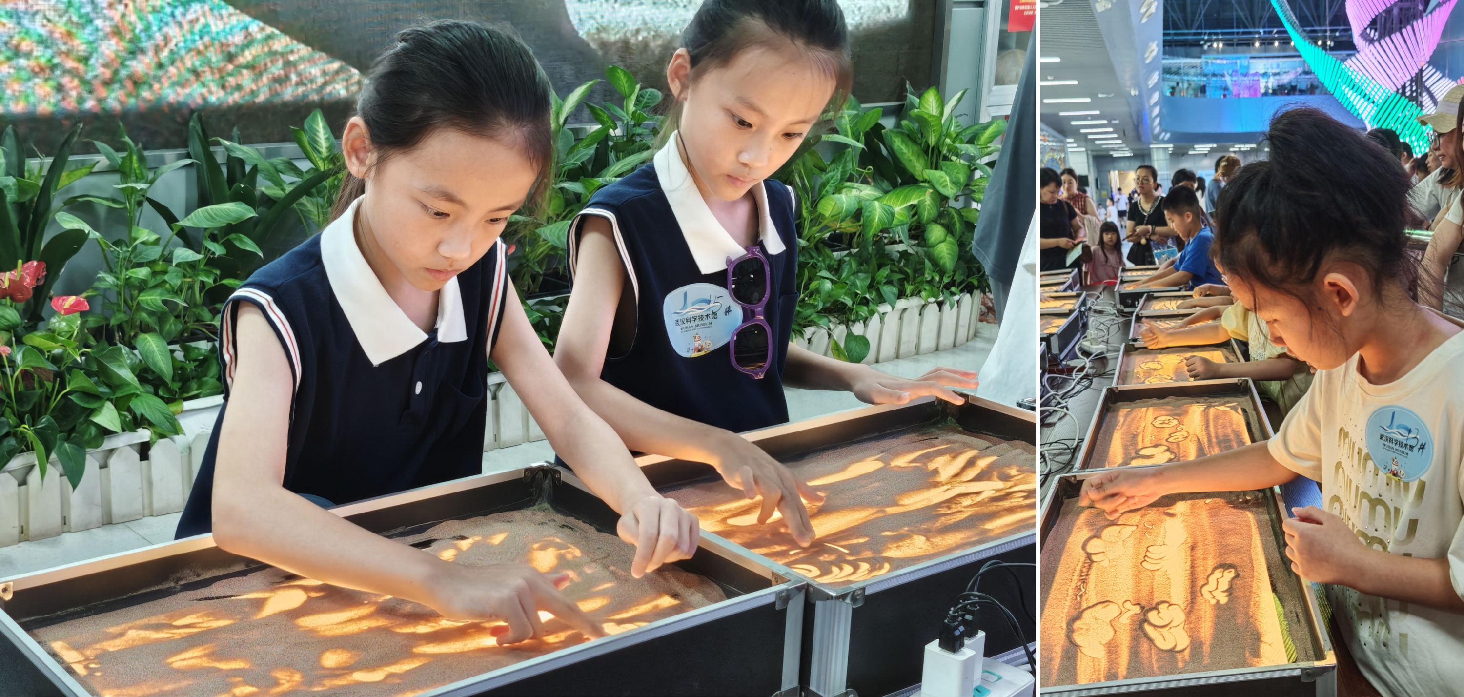 在学习了沙画创作的基础手法后,参与活动的小观众投入到沙画创作体验中。有的给美丽的大自然增添云朵和彩虹,有的则描绘想象中的极光、宇宙飞船。尽管第一次尝试沙画创作,小观众的手法并不娴熟,但他们的作品充满了对美丽大自然和神秘太空的向往。
