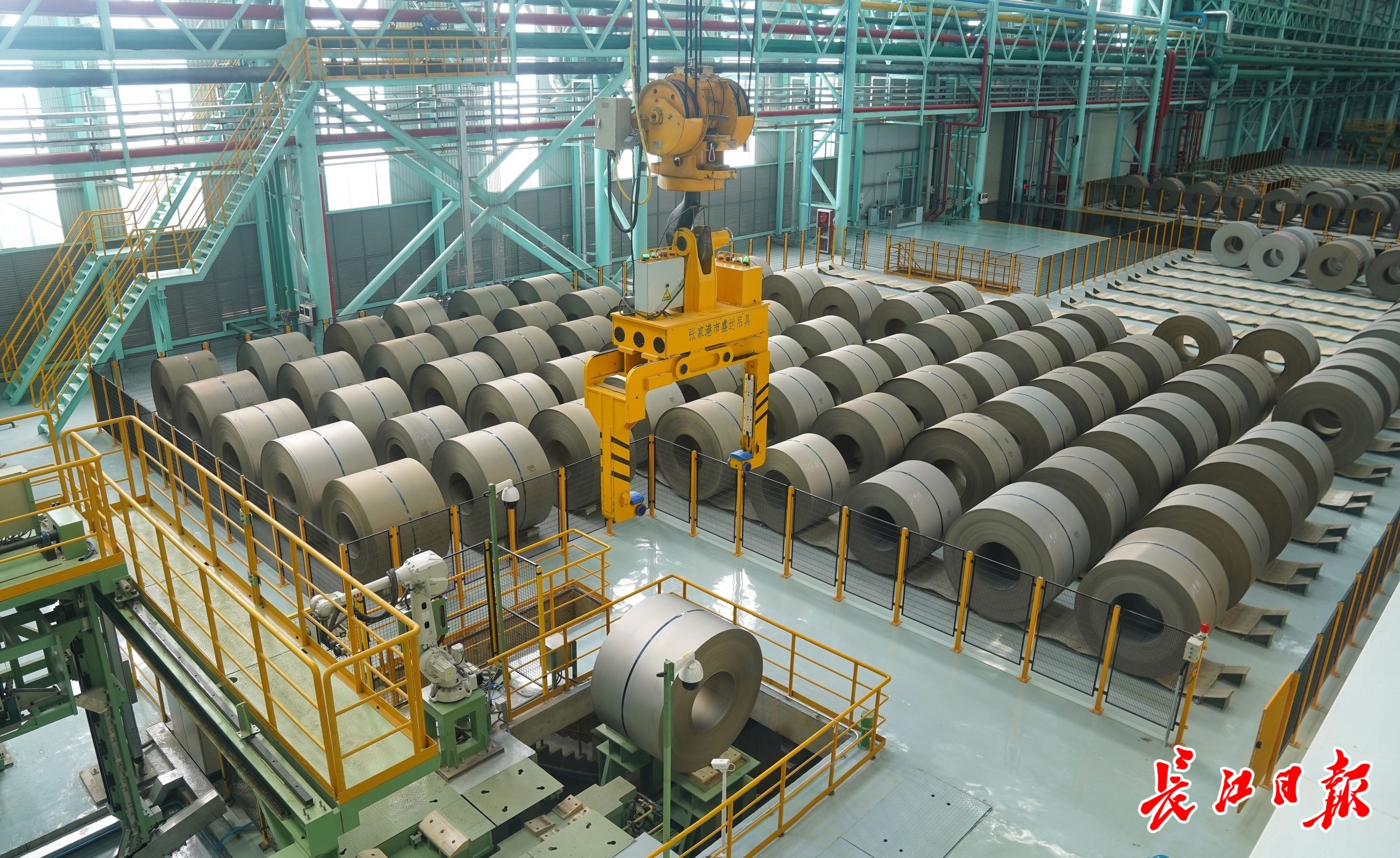 武汉钢铁有限公司硅钢部新能源无取向硅钢分厂“钢卷不落地”的现代物流模式有序运行。 长江日报记者肖僖 摄