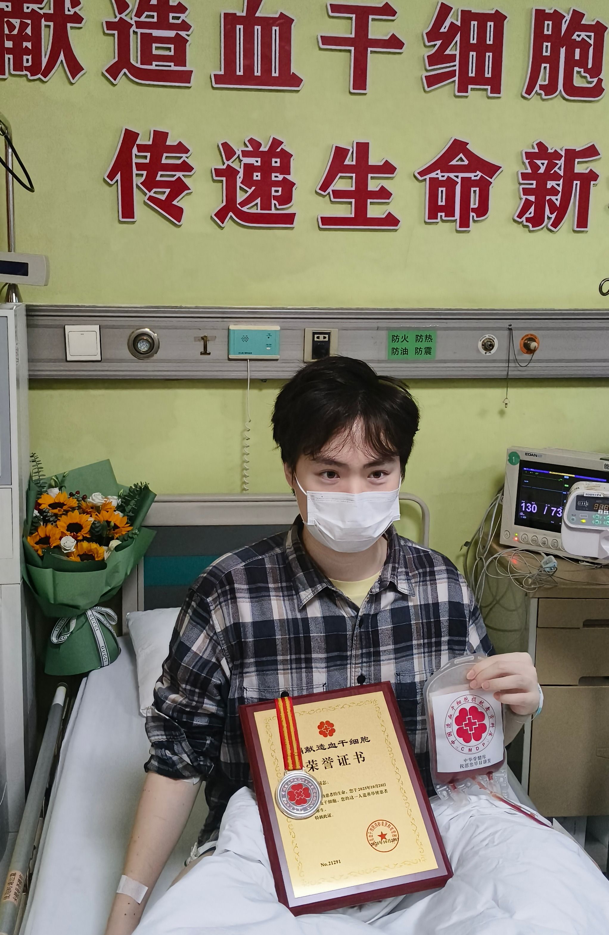 10月20日,在武汉某定点采集医院病房内,华中科技大学大四学生小虎(化名)成功捐献282毫升造血干细胞悬液,为一名陌生的血液病患者送去生的希望,他也成为湖北省第753例非血缘造血干细胞捐献者。