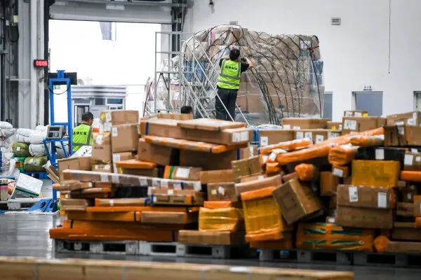 转运中心内,2.3万台分拣设备自动运行。打板区域内,25岁的带班组长丁杰和同事们正将包裹分类、组合,拼装成符合航空货运规格的大包裹。“平均每人每晚可打板装箱1吨多的货物。”