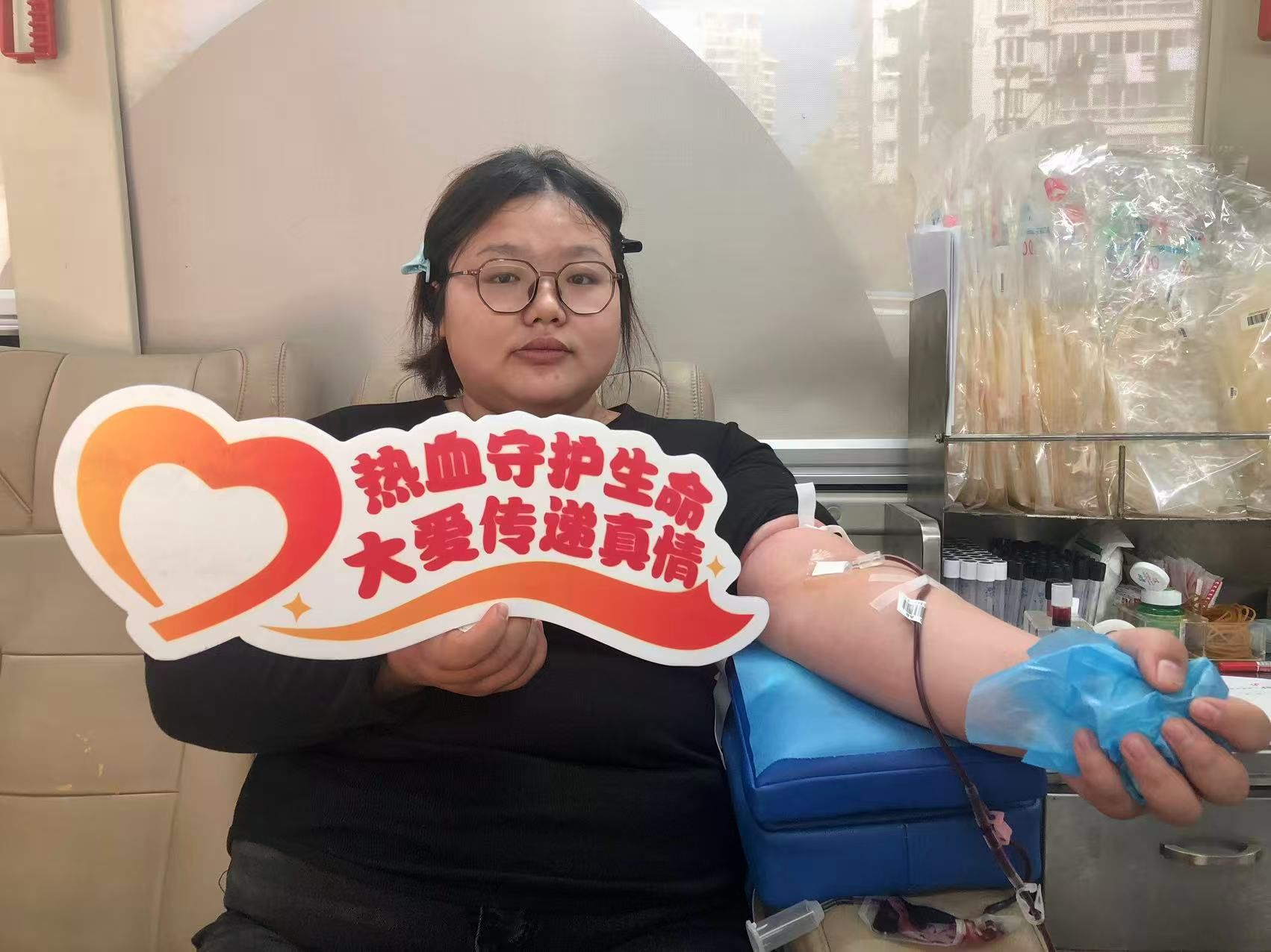 献血队伍中既有传承爱心的“接力者”,也有勇敢尝试的“新面孔”。制药工程专业的大四学生周敏怡来自湖北随州,正全力备战考研的她已是第二次献血,此次再次捐献400毫升,累计献血量达800毫升。“爸妈都多次参加无偿献血,奶奶住院时也接受过输血,我亲身体会到血液对生命的重要性,知道献血不仅能帮助他人,对亲属也有益处。”周敏怡一边按压献血后的手臂一边笑着说道,眼神里满是坚定。