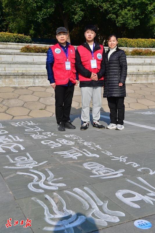 “书法父子”吴浩(左)、吴曦(中)与吴曦妈妈蔡慧(右)。 李永刚 摄