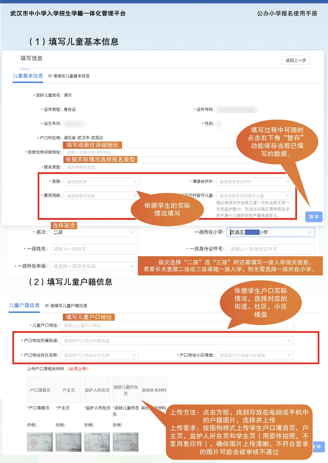 同时,孩子仅有武昌户籍、落户武昌区的大学生子女(孩子户口仍在市外)、持有武昌区的居住证(孩子户口在武汉市外),均可在武昌入学。其中房户不一致的将统筹安排,持有武昌区的居住证(孩子户口在武汉市外)需由适龄子女监护人出示户口簿、武昌区有效居住证、劳动合同(或者经营许可证)等能证明有合法稳定就业的材料、不动产证(房产证或租房协议)等资料。