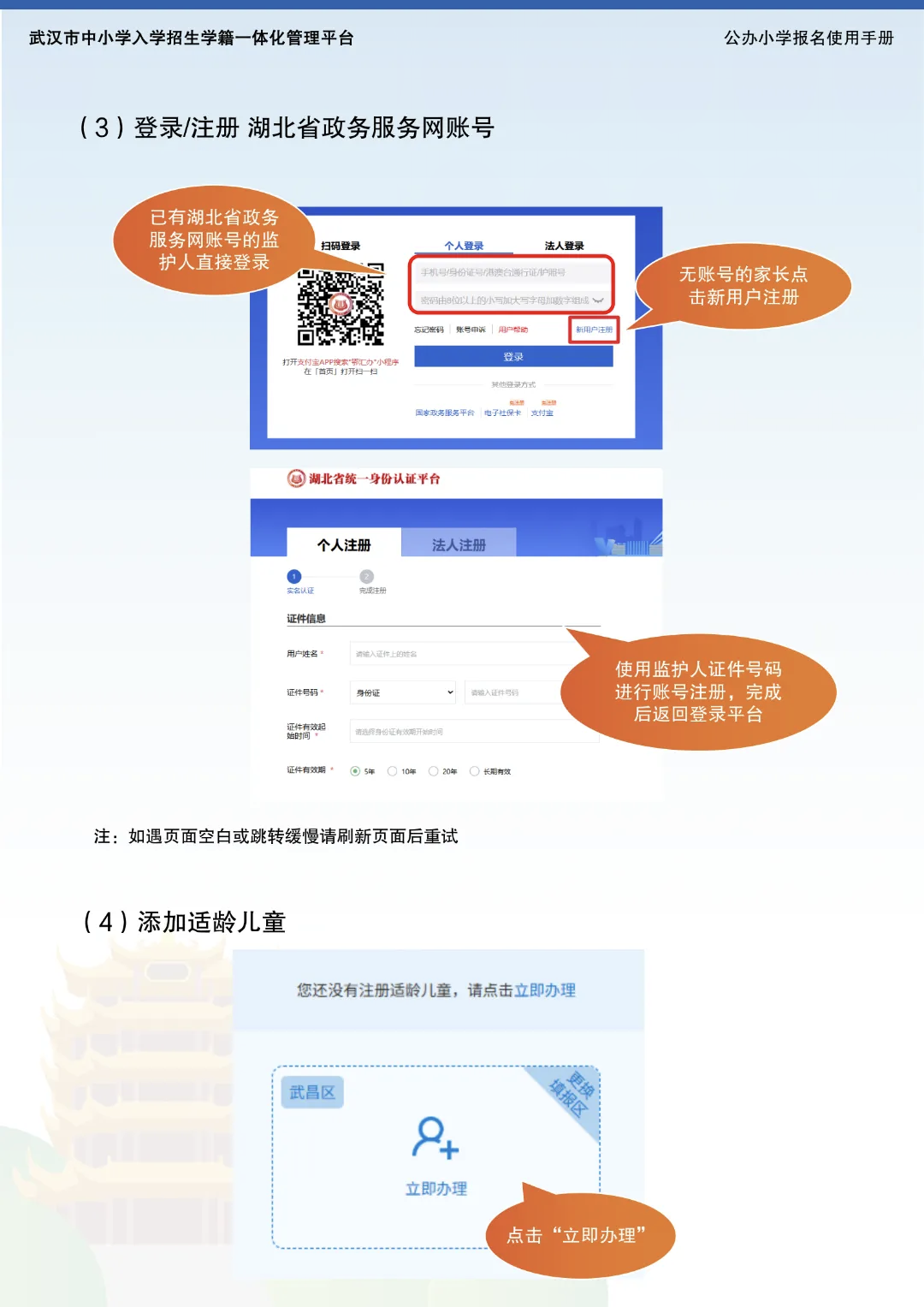 新生入学网络登记时间段为3月18日0时—28日24时,适龄儿童监护人可登录湖北政务服务网(http://zwfw.hubei.gov.cn/)或“鄂汇办”APP,通过“高效办成一件事”板块中“教育入学一件事”办理事项,选择“武昌区”端口进入“武汉市中小学入学招生学籍一体化管理平台(https://zsrx.whebd.cn/)”,按相关要求填入信息,完成登记流程。未按要求完成登记的新生可于5月11日—15日补登记,在上述时间段仍未完成登记的新生于8月25日—30日补办入学手续,由区教育局统筹安排。无法线上操作的家长,可于3月25日—27日携带户口簿、不动产证等资料,到附近学校或区教育局寻求现场协助。