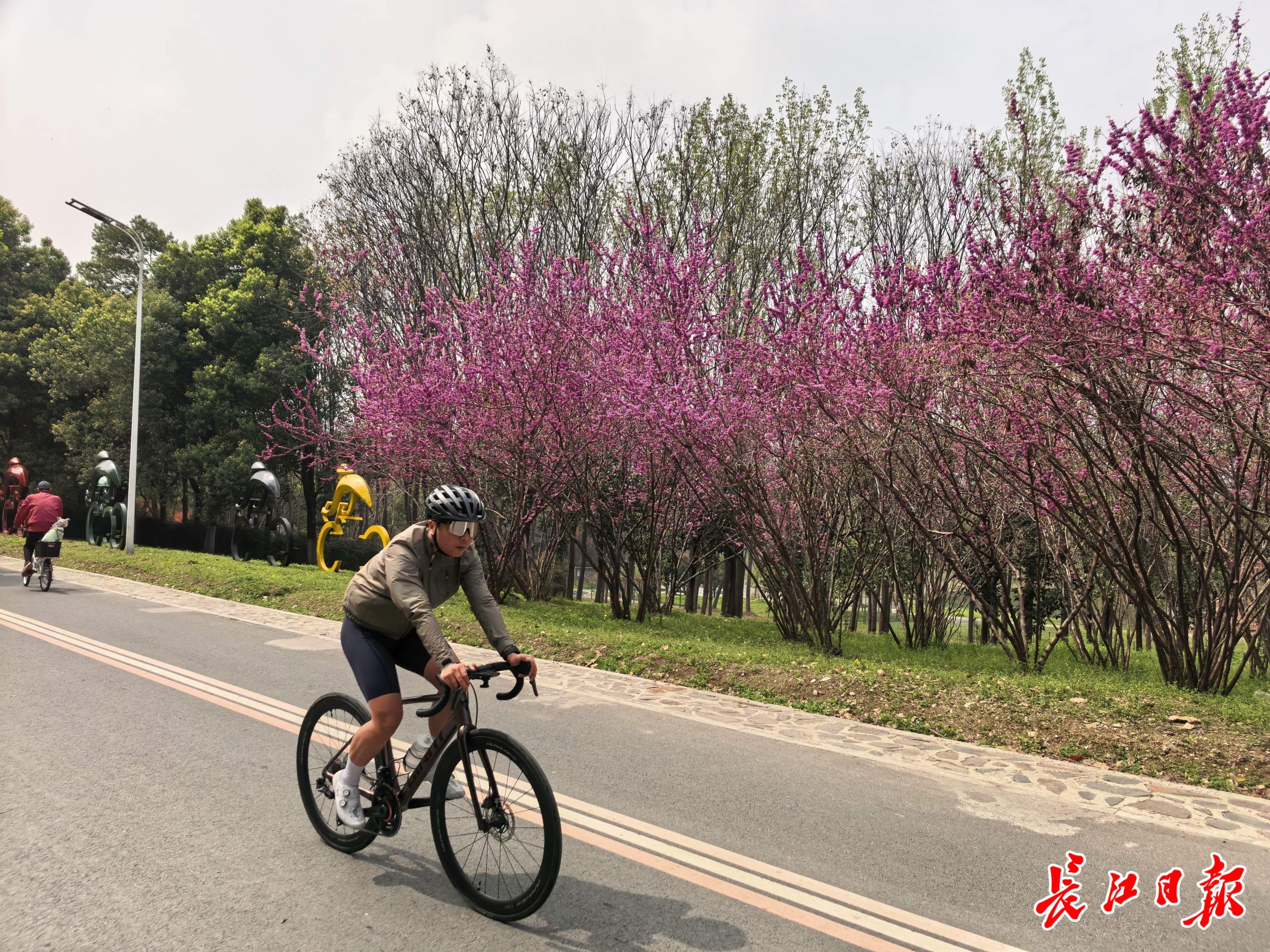 4月1日上午,天清气爽。张公堤绿道三金潭入口,唐女士身穿一身时尚精致的骑行服,俯身跨上公路自行车,轻巧地跃上堤顶,接下来她要完成20公里的骑行。车轮飞转带起坠落的花瓣,堤边公园里,有老人在树下打太极;绿道上,年轻的妈妈正带着孩子放风筝。