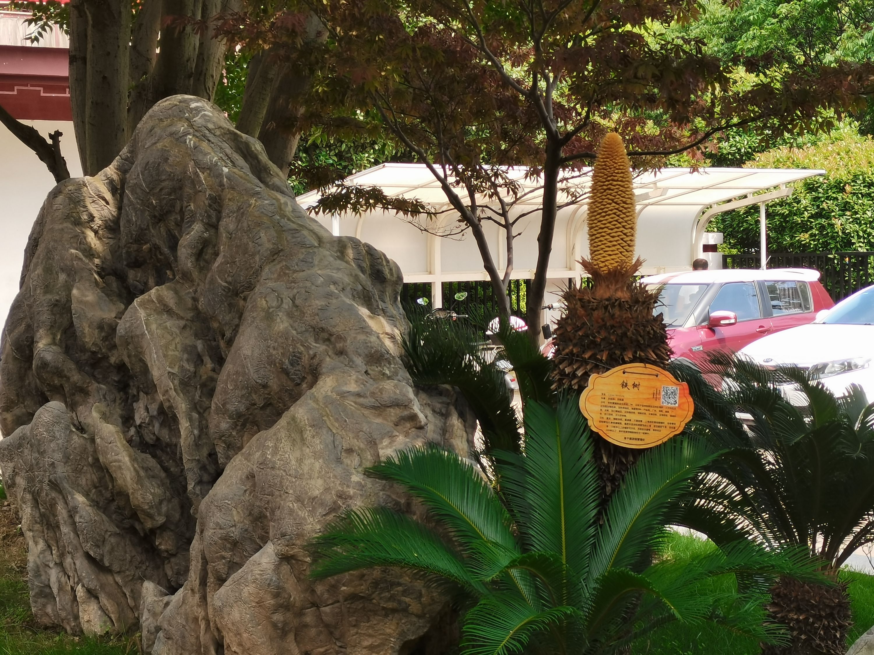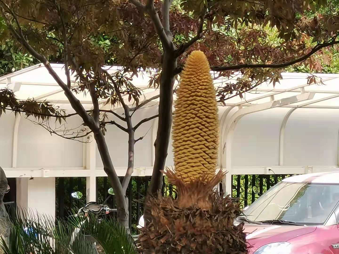 花坛中央四株高矮参差的铁树种植在一块卧石旁,三株矮点的铁树绿叶繁茂。而另一株开花的铁树有1米多高,一片叶子也没有,光秃秃的树干顶端顶着一个黄色的柱状物,格外醒目,这便是那株开着雄花的铁树。