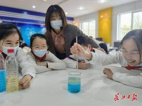 学生朱弈霏在与小伙伴的合作中也有新发现。她说,大家先倒入水再倒入油,水油会自然分离。假如继续往容器里注入水,水会穿过油层与下层的水融合,水油又自然分层了。大家都觉得很奇妙。后来,在老师的讲解下他们才了解到,原来是因为水的密度高于油的密度,在地球上受重力的影响所致。