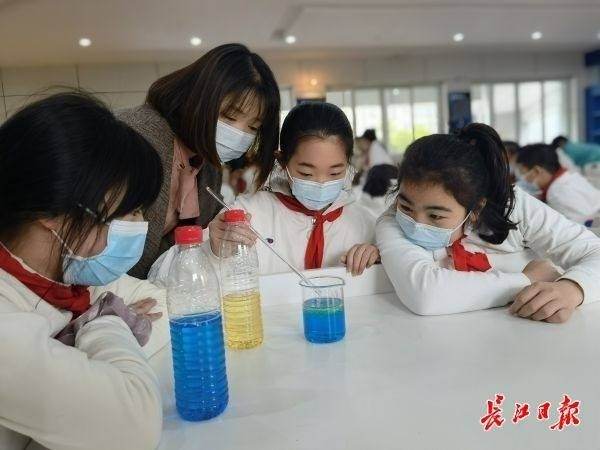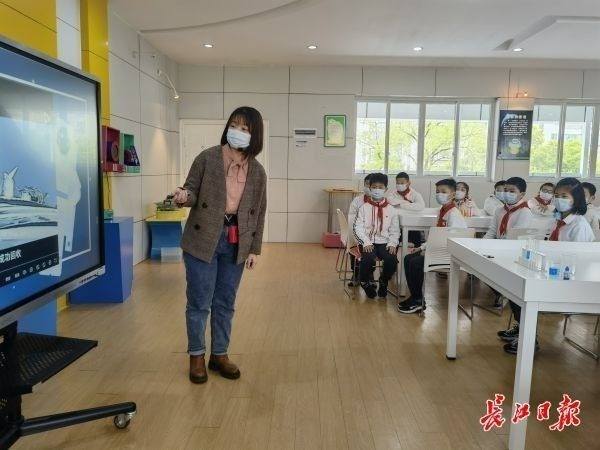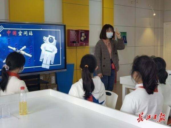 武汉市百优班主任胡敏“客串”地面实验老师。(记者向洁 摄)