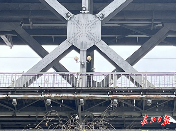 武汉长江大桥铁路层悬挂的路灯也是老样式的灯具。 记者刘海锋 摄