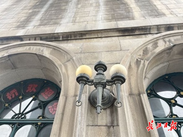 在汉阳桥头堡一楼的墙壁上,记者也发现了一盏宫灯。记者注意到,这盏宫灯整体造型也与桥面上的老宫灯有所不同——这盏宫灯原本由三个呈品字形排列的白色圆形灯组成。此时,顶部的灯罩已经不见了,只剩两端的两个灯罩,灯架呈现铜绿色。
