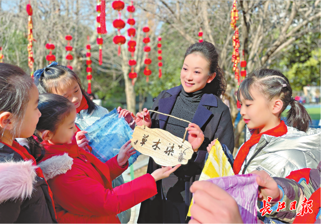 这场校园“超级变变变”是由各科老师带领“劳动小匠人”共同完成的。在辞旧迎新之际,学校启动“生态校园唤醒计划”,开展了“把课程种在校园里”特色活动。在老师们的指导下,低、中、高年级的学生分别通过“豆豆总动员”“草木染”“看见·落叶”等主题活动,从辨识花草树木、五谷杂粮开始,通过参与收集、清洗、浸染、手工制作等劳动实践,让落叶、果皮、旧布等材料在学生们手中焕发出新的光彩。