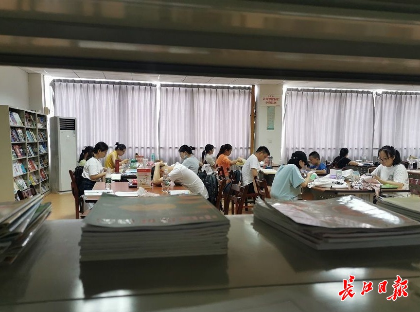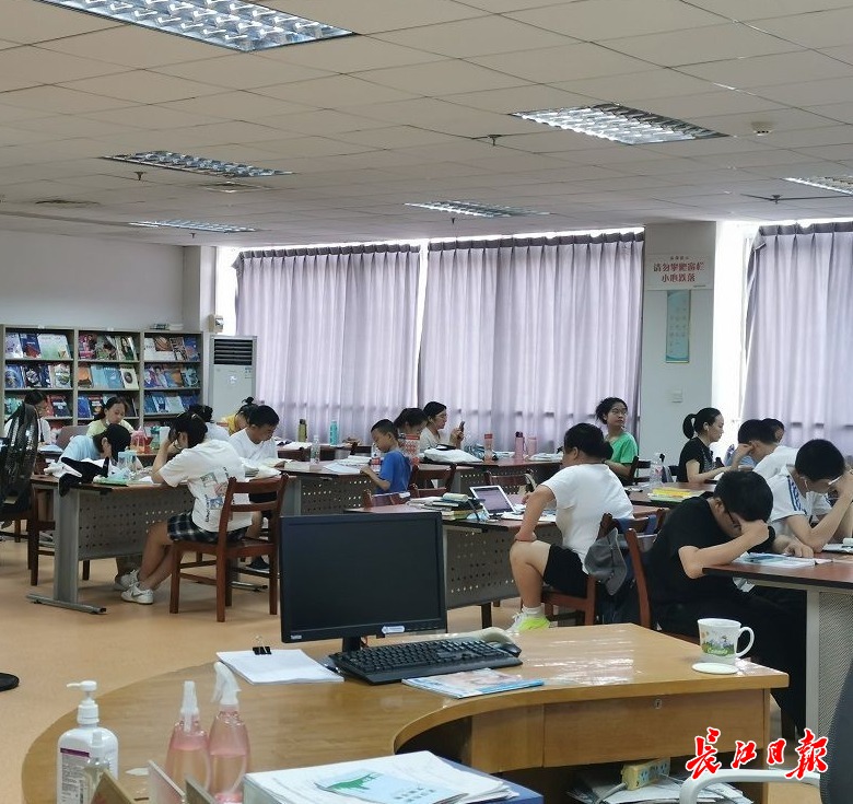 15时许,江汉区图书馆综合借阅室和自习室内已基本满座,不少孩子坐在书架边的地上看书。该馆每天8时30分开放,17时30分闭馆。工作人员介绍,上午10时之后来,就不好找位置了。
