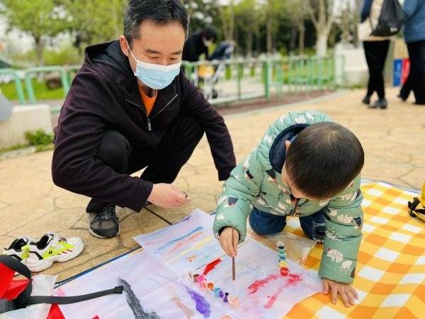 在老师的引导下,孩子们认识了风筝的结构、涂料的组成。随后,孩子和爸爸手拿画笔,利用竹签和空白画纸,发挥父子间的无限创意,在风筝上勾画出独特的艺术图案。爸爸们和孩子一起大胆涂鸦,不一会儿,一个个充满童趣的风筝作品就完成了。孩子们手拿自己心爱的作品,个个笑逐颜开,和爸爸一起享受着温暖的亲情时光。