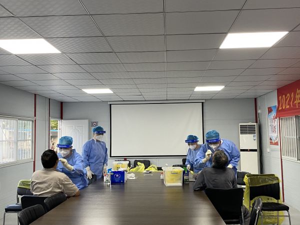 湖北省直属机关医院医护人员来到工地为工人采样。通讯员潘城岗 摄