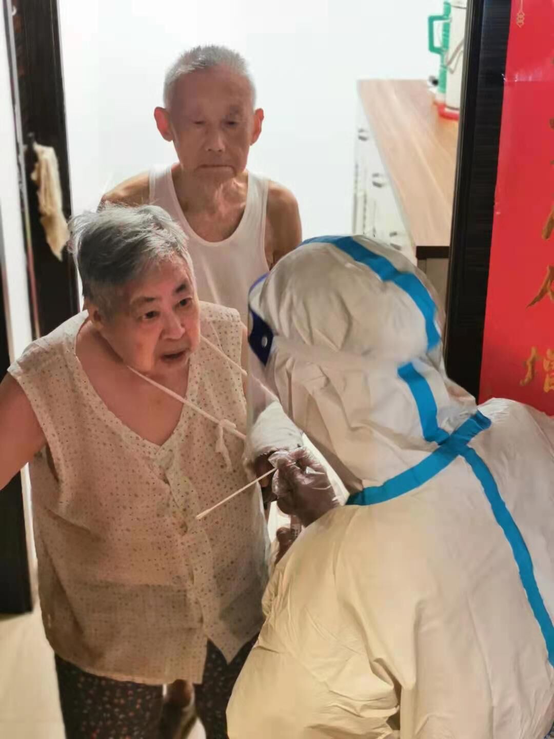 社区网格员曾庆璋费力地敲开了老人的家门,两位老人看到上门采样的医护人员,感激地说:“物业管家小肖给我们买菜买药送上门,看望我们,今天医护人员又上门为我们老两口进行核酸检测,谢谢谢谢呀。”