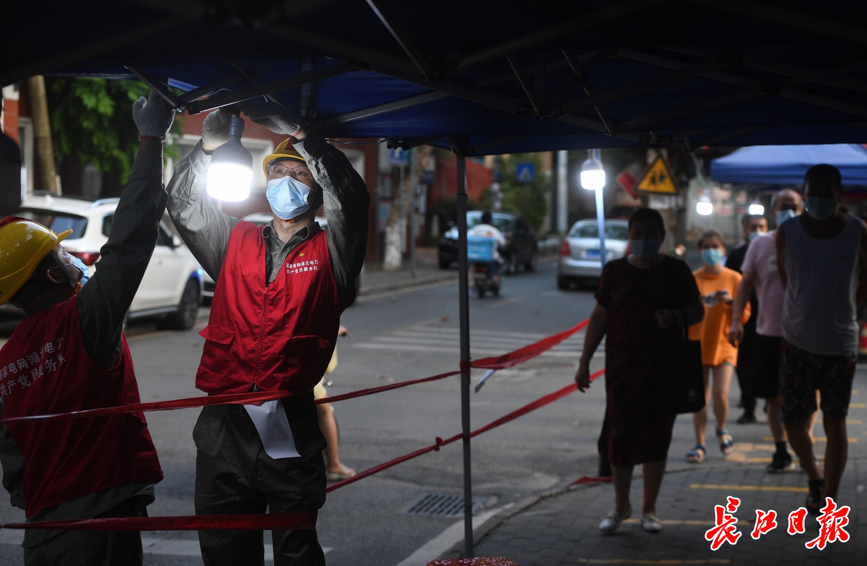 8月4日傍晚,汉阳大桥社区的核酸检测采集点,国网武汉供电公司汉阳供电营业所的电力员工紧急安装应急照明灯,保证医护人员在明亮的灯光下快速有序为居民进行核酸检测。 记者周超 摄
