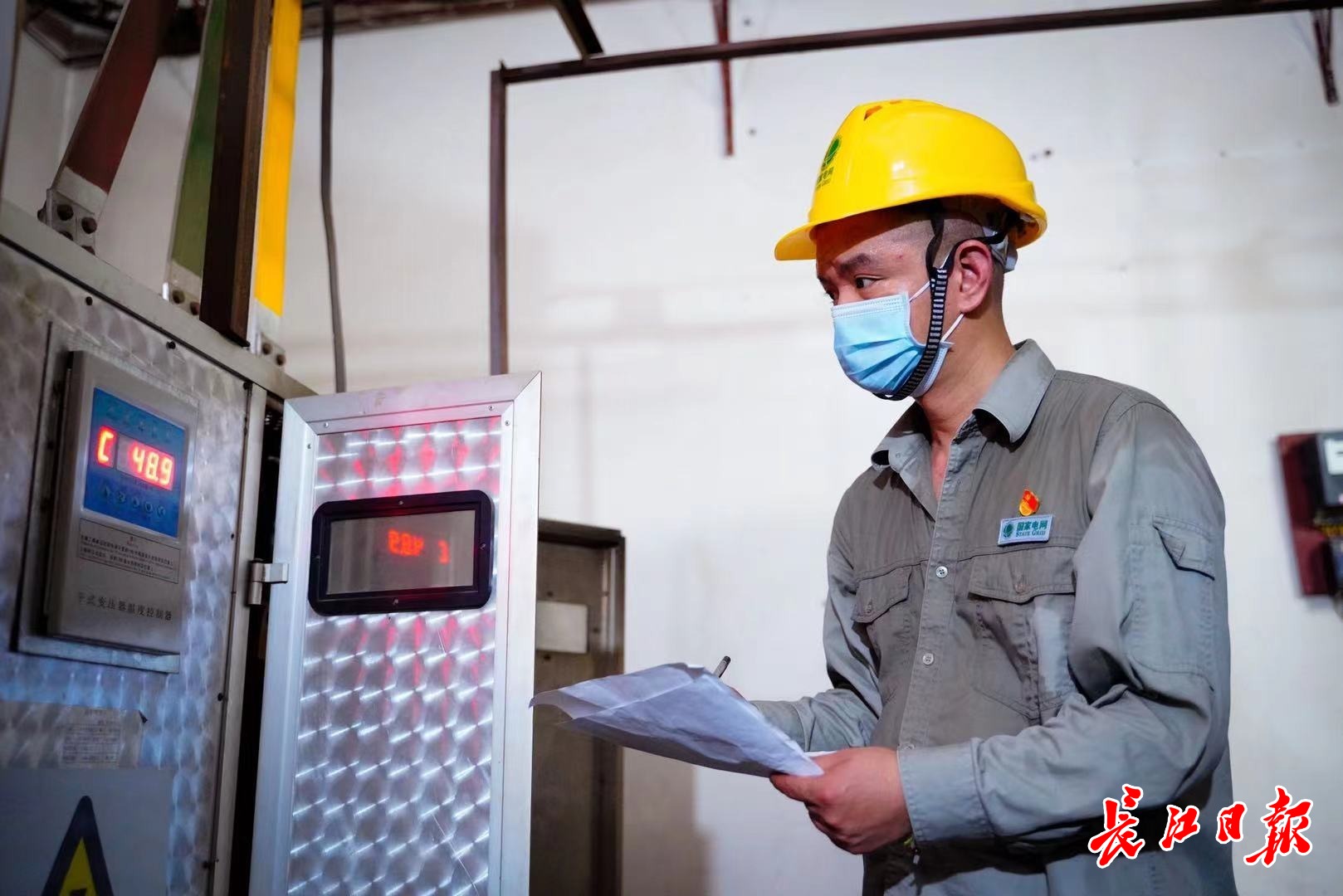 8月3日,国网武汉供电公司汉口客服中心党员刘涛在重点防疫单位检查用电设备安全,配电室内非常闷热,不到15分钟,汗水就已湿透衣背。 通讯员供图