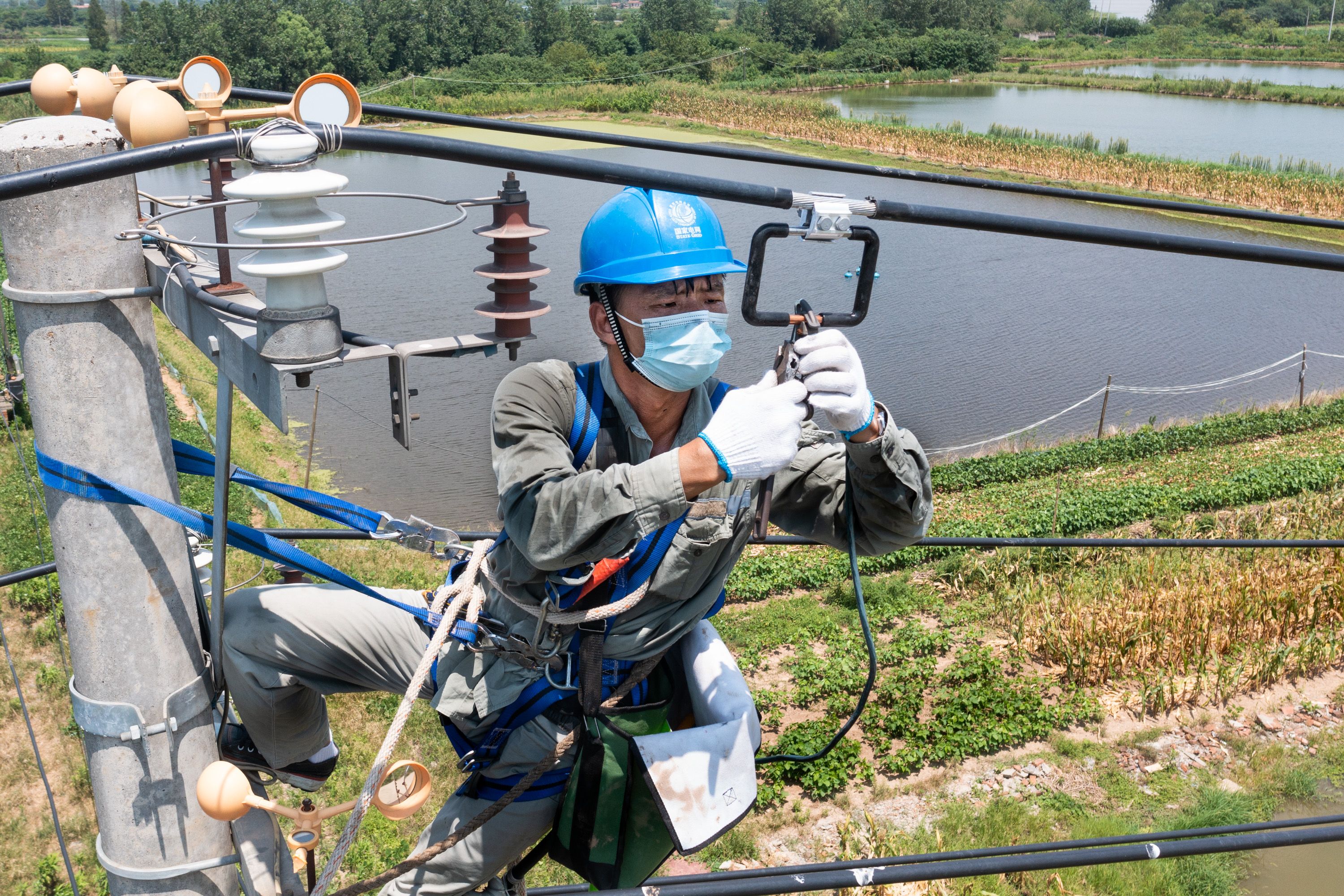 8月7日,汉南区供电公司配电运检班丁杰来到辖区内一处鱼塘,发现这里护线环绝缘损坏。他立即打好安全带,蹬着脚扣,登上电杆顶端,更换烧损设备。通讯员提供