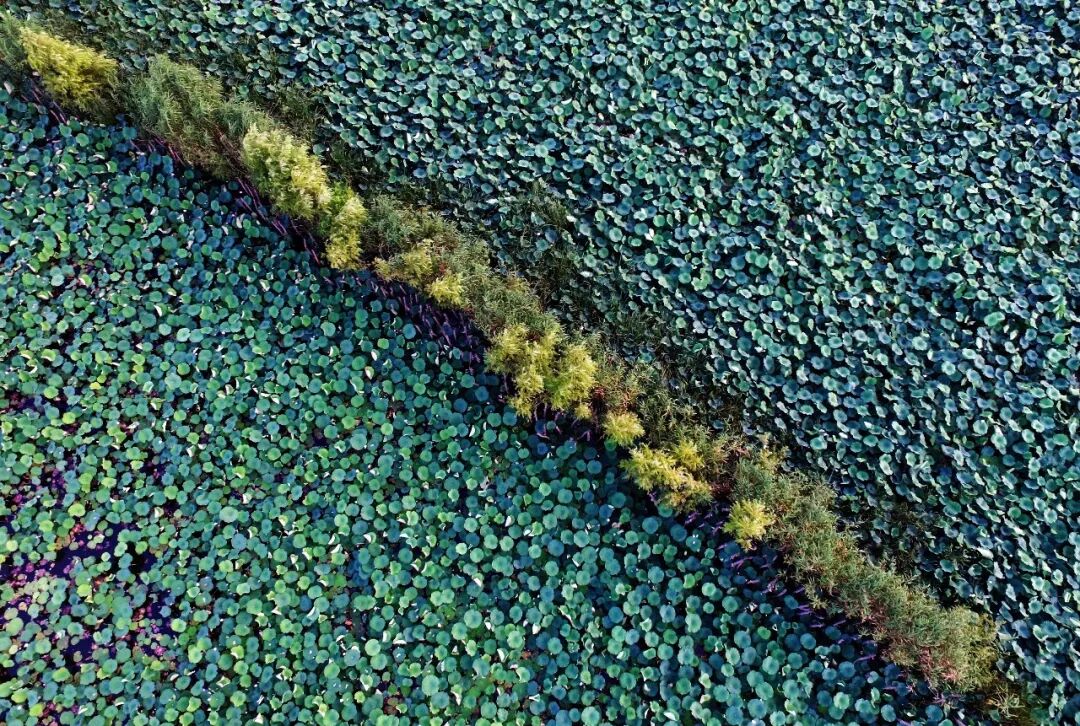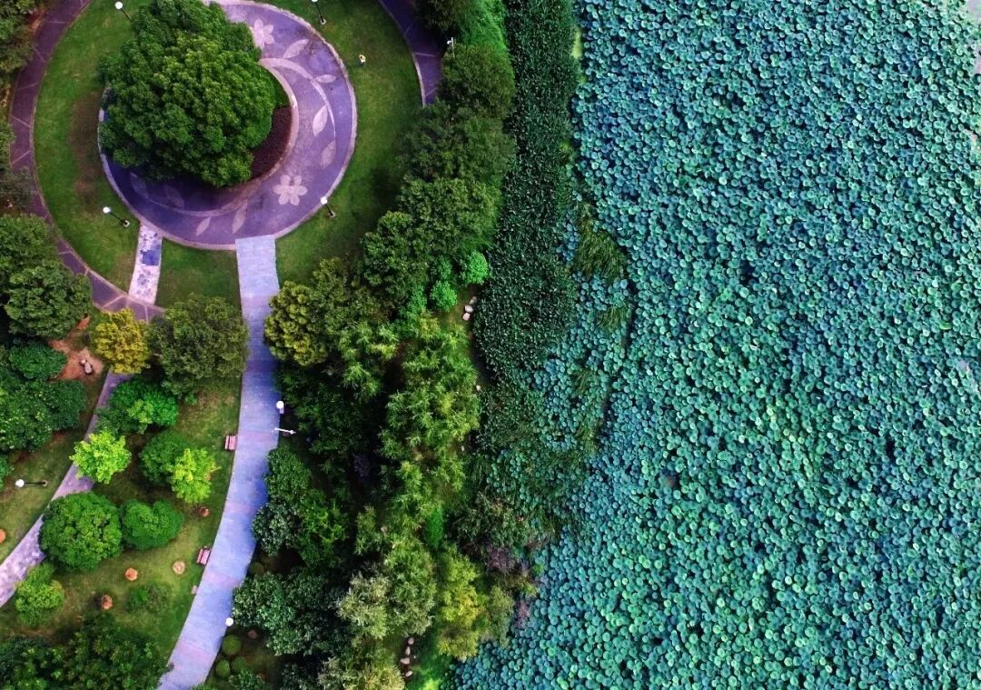 这是存在相册里,久久都舍不得删掉的鸟瞰图,它记录了繁盛的夏,公园的生命力。照片的尺寸也许不足1尺,但这荷花,却是绵延无际。