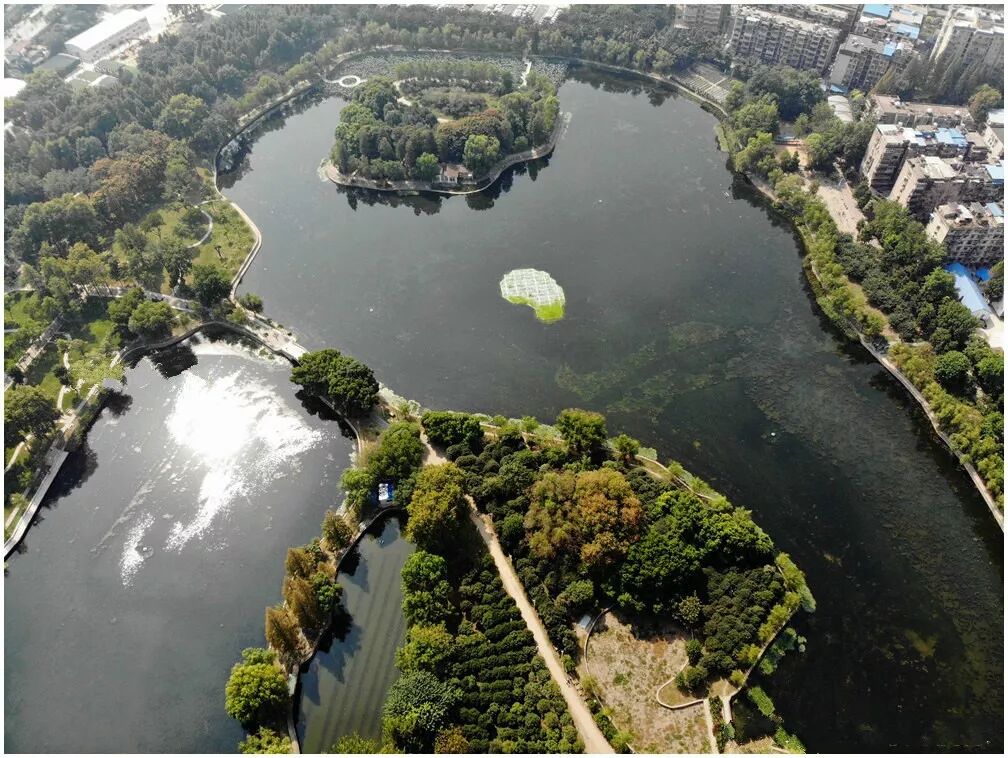 从空中俯瞰,公园的建筑物组合成一把长长的“勺子”,勺柄处还有一颗醒目的五角星。一条蜿蜒的湖,像一条翠带环绕整个公园,形成了以湖水为特征的园林绿化中心。