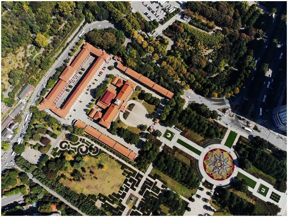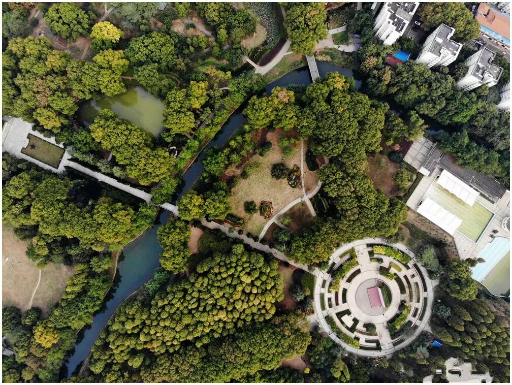 独特的红砖瓦墙整齐排列,绿树成荫点缀其中,从空中看来,古典的园林之美呼之欲出。