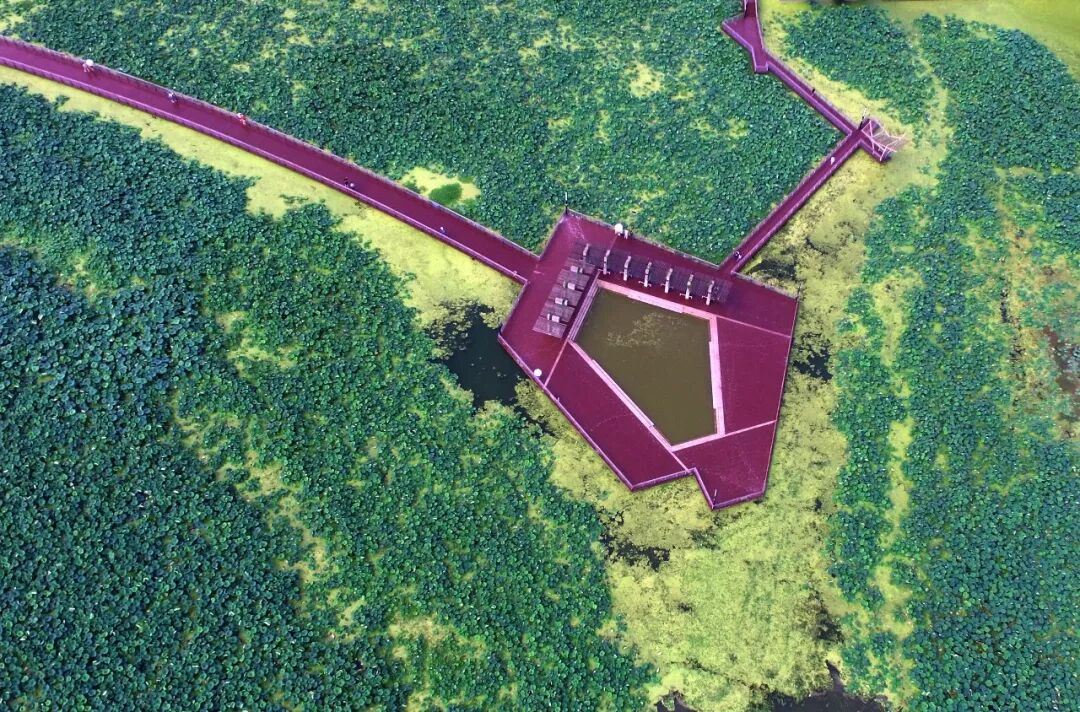 接天莲叶无穷碧,铺陈出一张绿色的图景,栈道弯弯曲曲,勾勒出最美的滨江之夏。